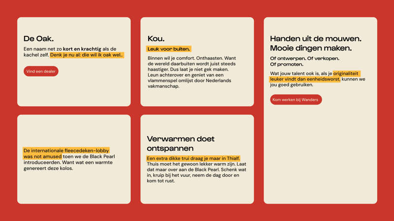 Ik denk dat het goed is om zo’n set menselijke karakteristieken terug te brengen tot één krachtig woord. Dat ene woord is dan de definitie van je merkpersoonlijkheid. Dat deed ik bijvoorbeeld ook voor de sympathieke kachel- en haardenbouwers van Wanders.